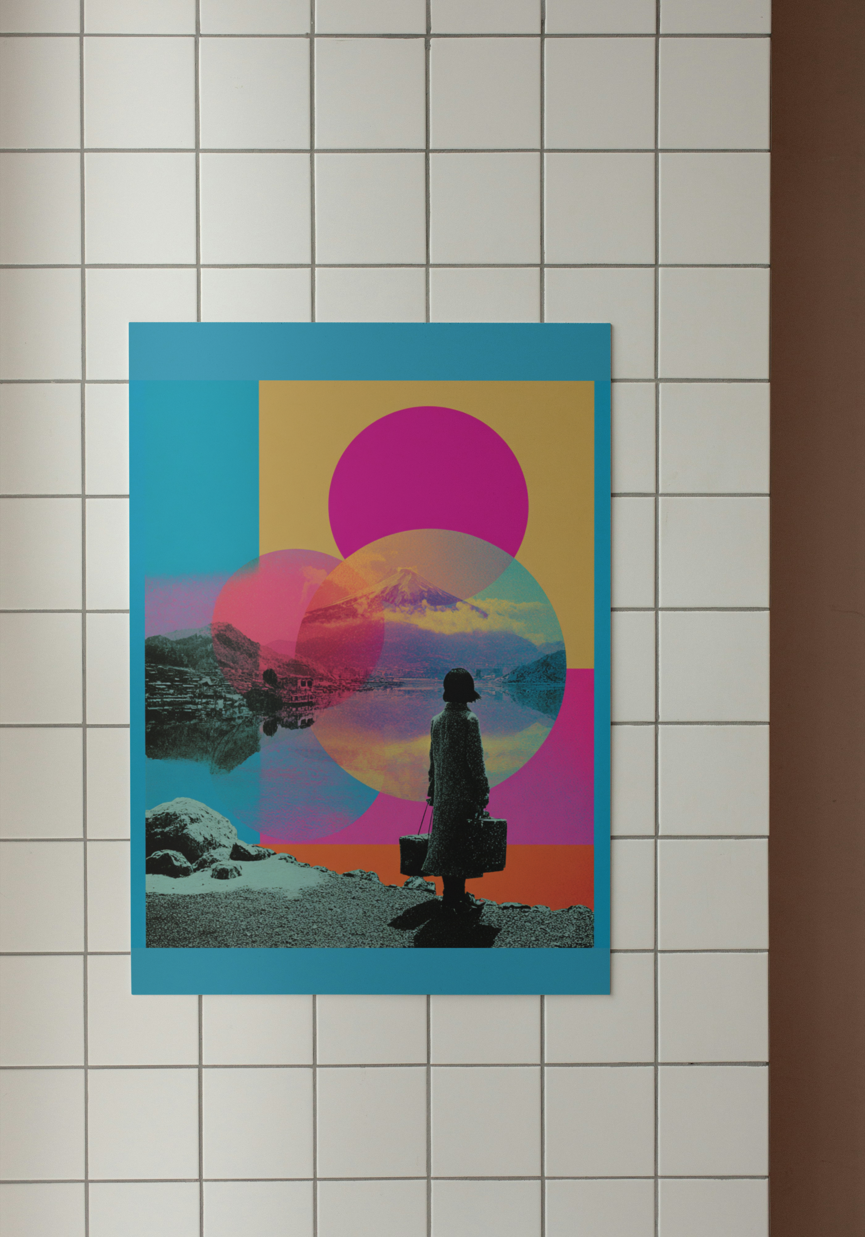 A vibrant blend of nostalgia and futurism, this Japanese pop art poster captures a solitary figure staring across a lake at Mount Fuji, layered beneath surreal, oversized neon circles. The bold cyan-pink-yellow palette and overlapping textures channel a retro travel ad meets synthwave minimalism, evoking themes of departure, reflection, and dreamlike escape.