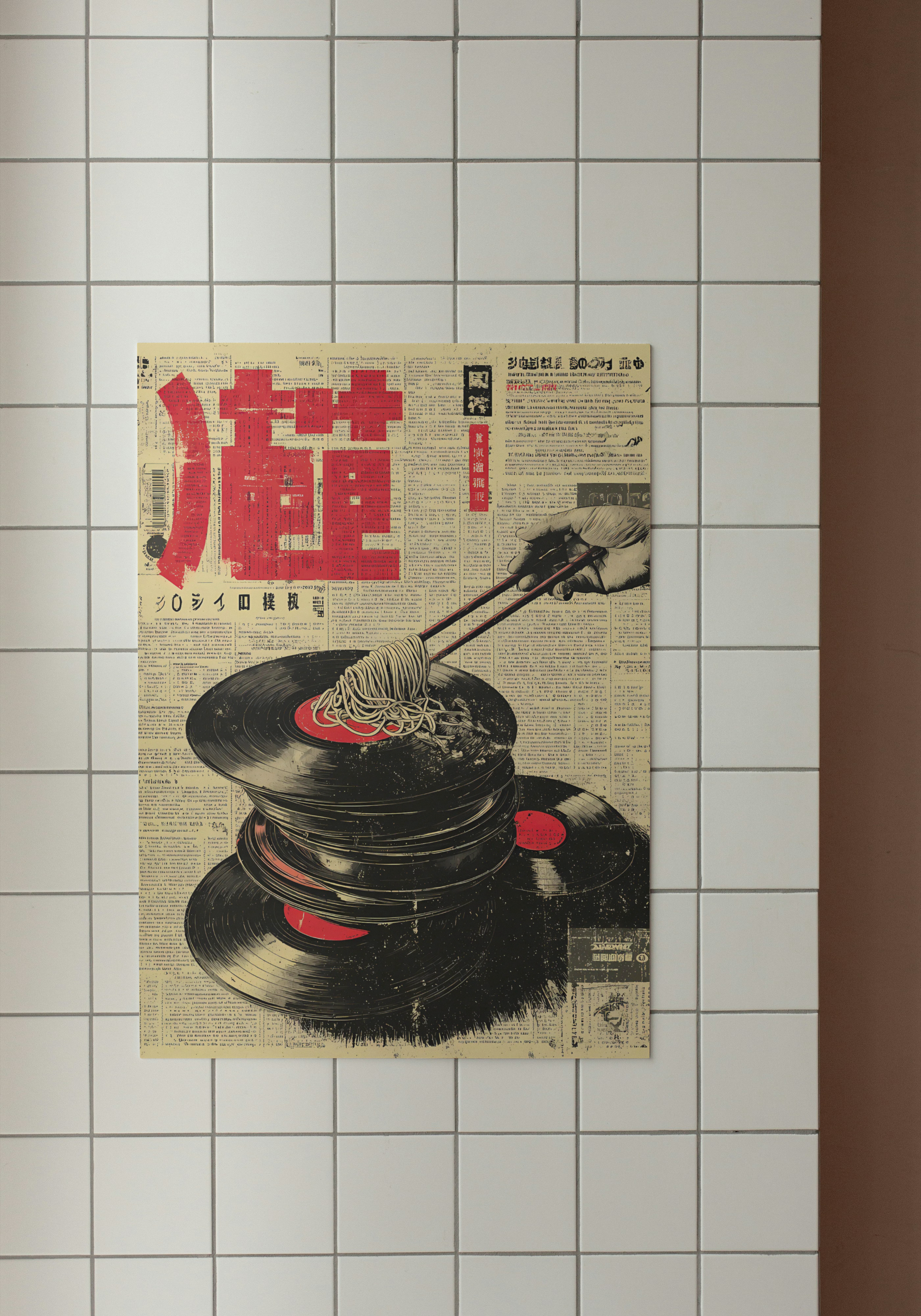 Where vinyl records meet ramen noodles, this Japanese urban pop art print is a wild blend of retro music culture, culinary symbolism, and gritty newspaper textures. Designed with a collage aesthetic, it features a hand lifting noodles from a stack of black records using chopsticks, all layered over aged Japanese newspaper clippings and bold red kanji typography.