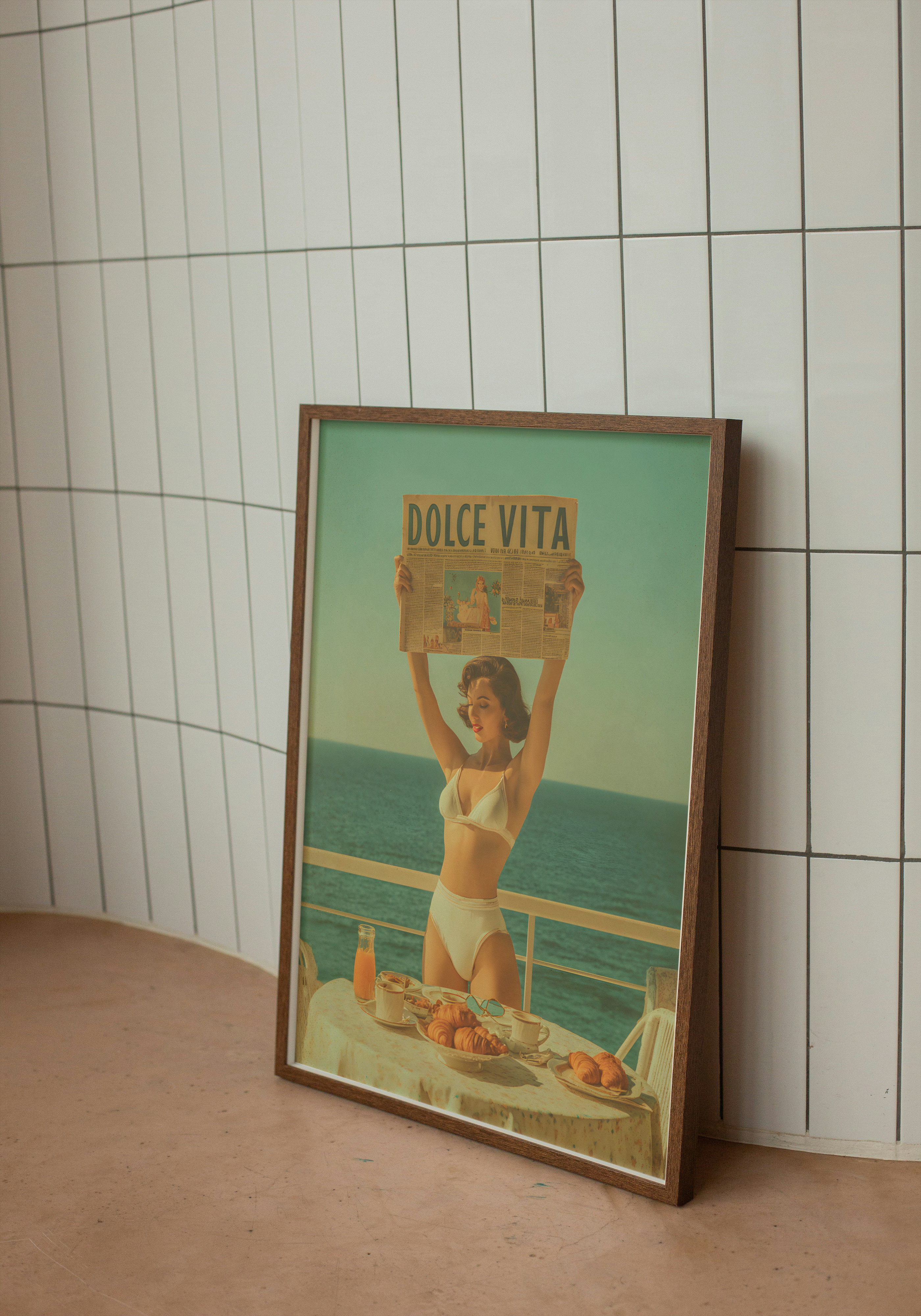 • Retro artwork of woman in bikini holding Dolce Vita newspaper on seaside balcony with breakfast table